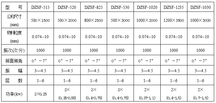 DZSF系列直線振動篩為雙振動電機驅(qū)動。當兩臺振動電機做同步、反向旋轉(zhuǎn)時,其偏心塊所產(chǎn)生的激振力在平行于電機軸線的方向相互抵消,在垂直于電機軸的方向疊為一合力,因此篩機的運動軌跡為一直線。兩電機軸相對篩面在垂直方向有一傾角,在激振力和物料自重力的合力作用下,物料在篩面上被拋起跳躍或向前作直線運動,從而達到對物料進行篩選和分級的目的。適用于粒度在0.074—5mm,含水量小于7%,無粘性的各種干式粉狀或顆粒狀物料的篩分。大給料粒度不大于10mm.。多層