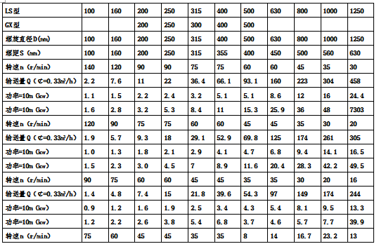 LS型、GX型螺旋輸送機(jī)主要技術(shù)參數(shù):