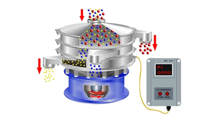 石墨粉超聲波振動篩設備啟動后,雙振動電機產生對稱激振力,帶動篩框做直線或圓形振動,使進料口落入的石墨粉沿篩面均勻滑動,符合目數要求的細粉透過篩孔進入下層,粗雜顆粒則從排渣口排出,完成基礎分級。同時,超聲波發(fā)生器輸出 20-38kHz電信號,經換能器轉化為機械振動并傳遞至篩網,高頻振動快速擊碎 200-1800 目石墨粉的團聚體,實時清除篩孔堵塞。兩種力互不干擾,振動保障篩分效率,超聲波解決堵網難題,最終實現石墨粉的粒度分離。